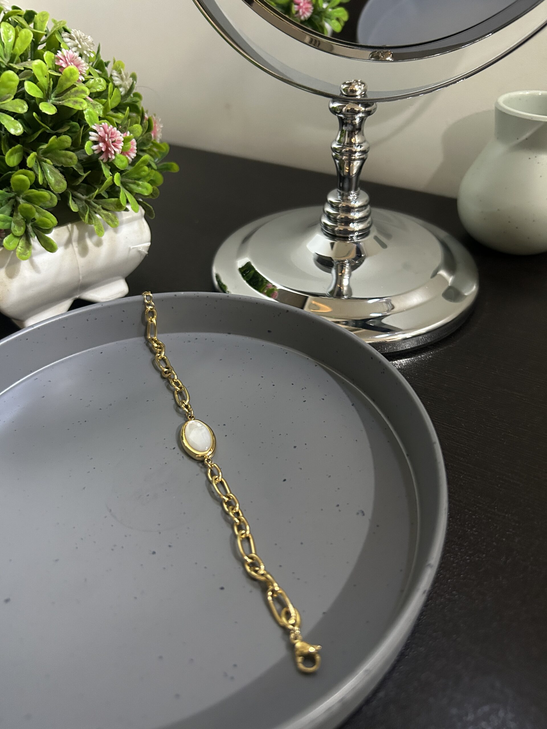 Sophisticated and timeless, the EvoraLuxe Gold Link Bracelet with White Stone adds effortless charm to your everyday style. Crafted with a sleek gold-plated chain and an elegant oval white stone centerpiece, this bracelet radiates understated luxury.